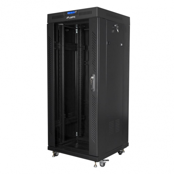 Armario rack de tipo independiente (free standing) de 19 pulgadas, ideal para instalaciones de red, servidores u otros equipos electrónicos. Cuenta con una capacidad de 27U, permitiendo alojar múltiples dispositivos de forma ordenada y segura.