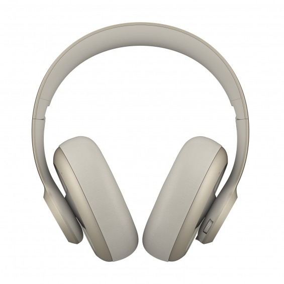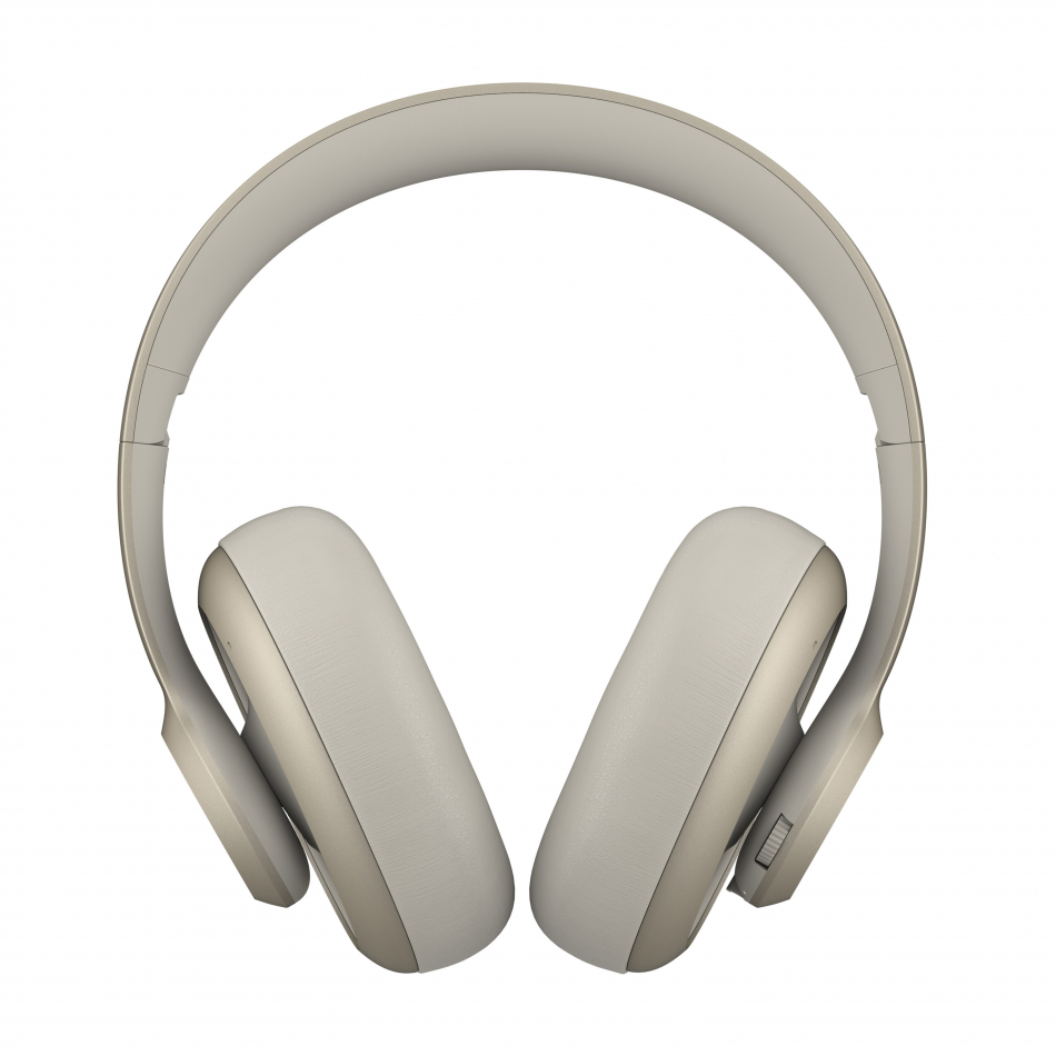 Diseño supraaural minimalista en color Silky Sand, con estructura plegable para facilitar su transporte y almacenamiento.