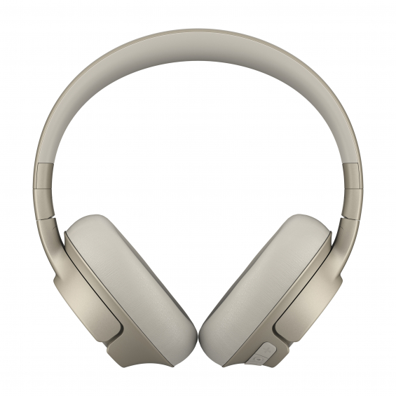 Diseño supraaural elegante y moderno en acabado Silky Sand, con estructura plegable y giratoria que facilita su transporte y almacenamiento.