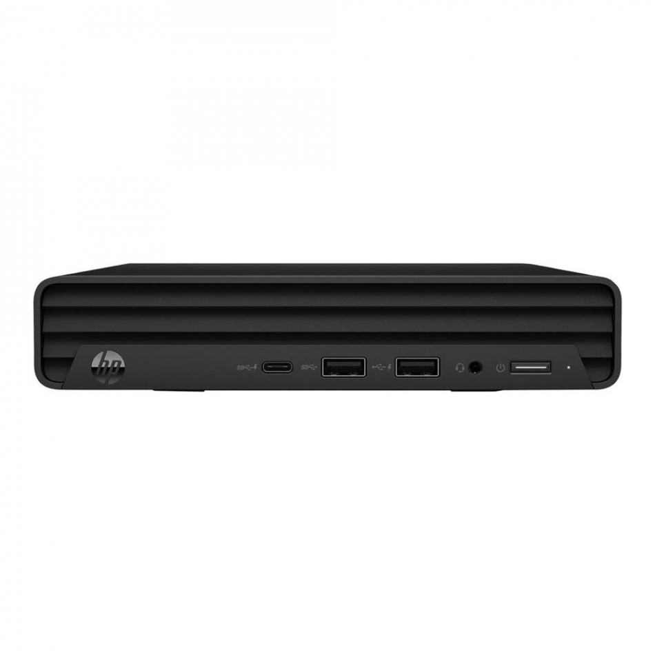 Formato mini PC de color negro. Dimensiones: 17.7 x 17.5 x 3.4 cm. Peso: 1.42 kg. Chasis con una bahía interna de 2.5" libre. Compatible con montaje y seguridad avanzada.