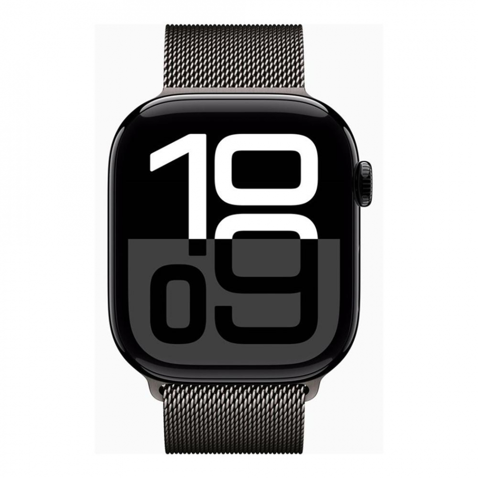 La estética del Apple Watch Series 10 destaca por su caja rectangular de 46 mm en titanio reciclado color pizarra, combinada con una elegante pulsera Milanese Loop de malla de acero inoxidable. Su pantalla LTPO3 Retina OLED Always-On ofrece una visibilidad excepcional, incluso a plena luz del día, con una luminosidad de hasta 2000 nits.