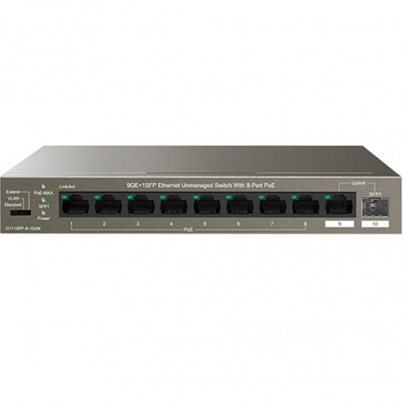 G1110PF-8-102W Switch Ethernet no administrado 9GE+1SFP con PoE de 8 puertos Compatible con los estándares IEEE 802.3, IEEE 802.3u, IEEE 802.3ab, IEEE 802.3x, IEEE 802.3af/at 8 puertos Ethernet Base-T de 10/100/1000 Mbps (datos/alimentación) 1 puerto Ethernet Base-T de 10/100/1000 Mbps (datos), 1 puerto SFP Base-X de 100/1000 Mbps Tabla de direcciones MAC de 16 K y aprendizaje automático de direcciones MAC Control de flujo full duplex IEEE 802.3x y control de flujo half duplex con contrapresión Estructura de conmutación de 20 Gbps para reenvío de velocidad de línea sin bloqueos Máxima salida PoE de un solo puerto: 30 W Consumo total de energía del switch: 102 W Tres modos Cambiar: Estándar, VLAN Descripción general del G1110PF-8-102W El conmutador Ethernet no administrado G1110PF-8-102W 9GE+1SFP con PoE de 8 puertos fue diseñado independientemente por IP-COM. Admite los estándares IEEE 802.3af/at para suministro de energía PoE, capaz de transmitir datos y suministrar energía para 8 cámaras PoE HD o puntos de acceso gigabit. La salida PoE máxima de un solo puerto es de 30 W y el consumo total de energía del conmutador es de 102 W. El G1110PF-8-102W admite tres modos de conmutación, lo que lo hace adecuado para implementaciones de redes complejas y es su opción ideal para videovigilancia y redes inalámbricas gigabit en escenarios como pymes, áreas residenciales, parques industriales, hoteles y escuelas. Conmutación de tres modos El conmutador admite tres modos de funcionamiento: estándar, VLAN y extendido, lo que permite una implementación de red flexible en casos complejos con un costo reducido. Protección contra rayos de 6 kV El switch admite protección contra rayos de 6 kV para los puertos y la fuente de alimentación, lo que reduce el riesgo de rayos inductivos y garantiza un funcionamiento estable incluso en caso de tormentas eléctricas. Fuente de alimentación PoE inteligente El switch ofrece 8 puertos PoE gigabit compatibles con los estándares IEEE 802.3af/at, capaces de transmitir datos y suministrar energía para cámaras PoE HD o puntos de acceso gigabit. La salida PoE máxima de un solo puerto es de 30 W y el consumo total de energía del switch es de 102 W. Puertos de enlace ascendente RJ45 y SFP El switch admite puertos de enlace ascendente RJ45 y SFP para una red flexible, sin necesidad de conexión en cascada en escenarios de transmisión de largo alcance. Especificaciones de hardware Estándares IEEE 802.3, IEEE 802.3u, IEEE 802.3ab, IEEE 802.3x, IEEE 802.3af, IEEE 802.3at Indicadores LED Un indicador LED Link/Act para cada puerto Un indicador LED PoE-MAX para cada dispositivo Un indicador LED Power para cada dispositivo Interfaces 8 puertos Ethernet Base-T de 10/100/1000 Mbps (datos/alimentación) 1 puerto Ethernet Base-T de 10/100/1000 Mbps (datos) 1 puerto SFP Base-X de 100/1000 Mbps Protección contra rayos Puerto: 6 kV Alimentación: 6 kV Modo de reenvío Almacenar y reenviar Capacidad de conmutación 20 Gbps Tasa de reenvío de paquetes 14,9 Mpps Tabla de direcciones MAC 16K Fuente de alimentación PoE IEEE Estándares 802.3af/at Alimentación PoE en los puertos 1-8 Voltaje de los núcleos 1, 2, 4, 5 es +, y de los núcleos 3, 6, 7, 8 es - Voltaje de entrada 100-240 V 50/60 Hz Dimensiones 177,5 mm x 104 mm x 26 mm (L*An*Al) Consumo de energía Consumo total de energía: <,102 W Salida PoE máxima: 92 W Conmutación entre tres modos Conmutación entre tres modos a través de un interruptor DIP: 1. Estándar: modo predeterminado. En este modo, todos los puertos pueden comunicarse entre sí. 2. VLAN: en este modo, los puertos 1 a 8 están aislados entre sí, pero todos ellos pueden comunicarse con el puerto 9 y SFP1. Este modo ayuda a aislar la transmisión DHCP y a reducir la tormenta de transmisiones. 3. Extender: En este modo, los puertos 1 a 8 reducen la velocidad de negociación a 10 Mbps, pero transmiten hasta 250 m de distancia. Todos los puertos pueden comunicarse entre sí. Entorno operativo Temperatura de funcionamiento: 0 C - 45 C Temperatura de almacenamiento: -40 C - 70 C Humedad de funcionamiento: (10 % - 90 %) HR, sin condensación Humedad de almacenamiento: (5 % - 90 %) HR, sin condensación Certificados CCC, FCC, CE, RoHS