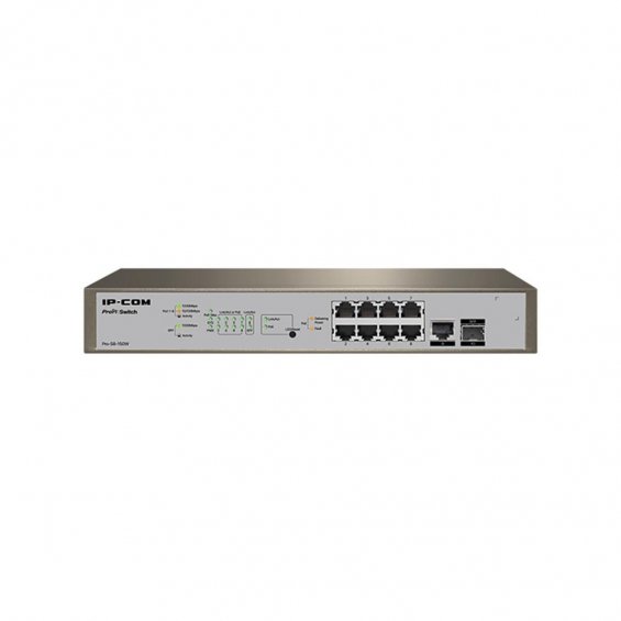 8 puertos Ethernet 10/100/1000 Base-T con PoE, 1 puerto Ethernet 10/100/1000 Base-T (datos) y 1 puerto SFP 1000 Base-X.