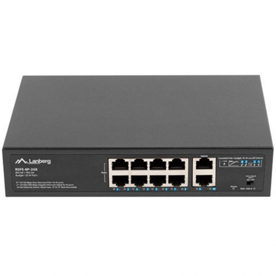 Dispone de un total de 10 puertos Ethernet: 8 puertos LAN de 100 Mbps con soporte PoE+ y 2 puertos LAN de 1 Gbps. Es compatible con conexiones Ethernet a través de 2x 1000BASE-T y 8x 100BASE-T PoE+.