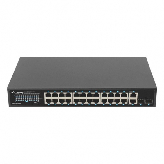 Dispone de 26 puertos Ethernet, de los cuales 24 son puertos 1000BASE-TX compatibles con los estándares PoE 802.3af y 802.3at, y 2 puertos Uplink de 1000 Mbps. Además, incluye 2 puertos SFP de 1000BASE-X para conexiones de fibra óptica, lo que permite una integración flexible en redes híbridas. La velocidad máxima de conexión es de 1 Gbps.